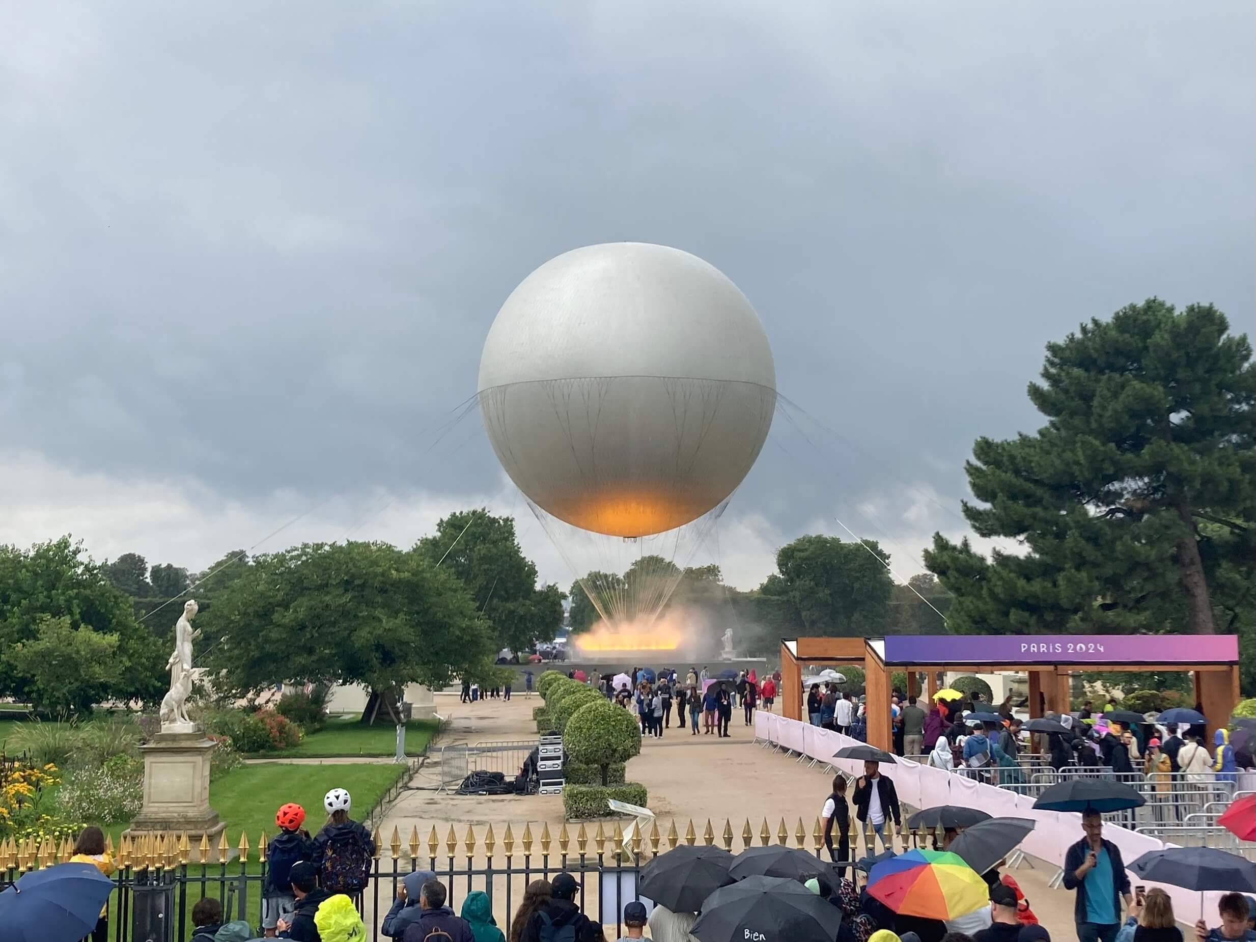 ※一方で、チュイルリー庭園の聖火台前にはたくさんの人が集まっている。夜間は高さ60mの上空に浮かぶため、まったく人が途切れない。