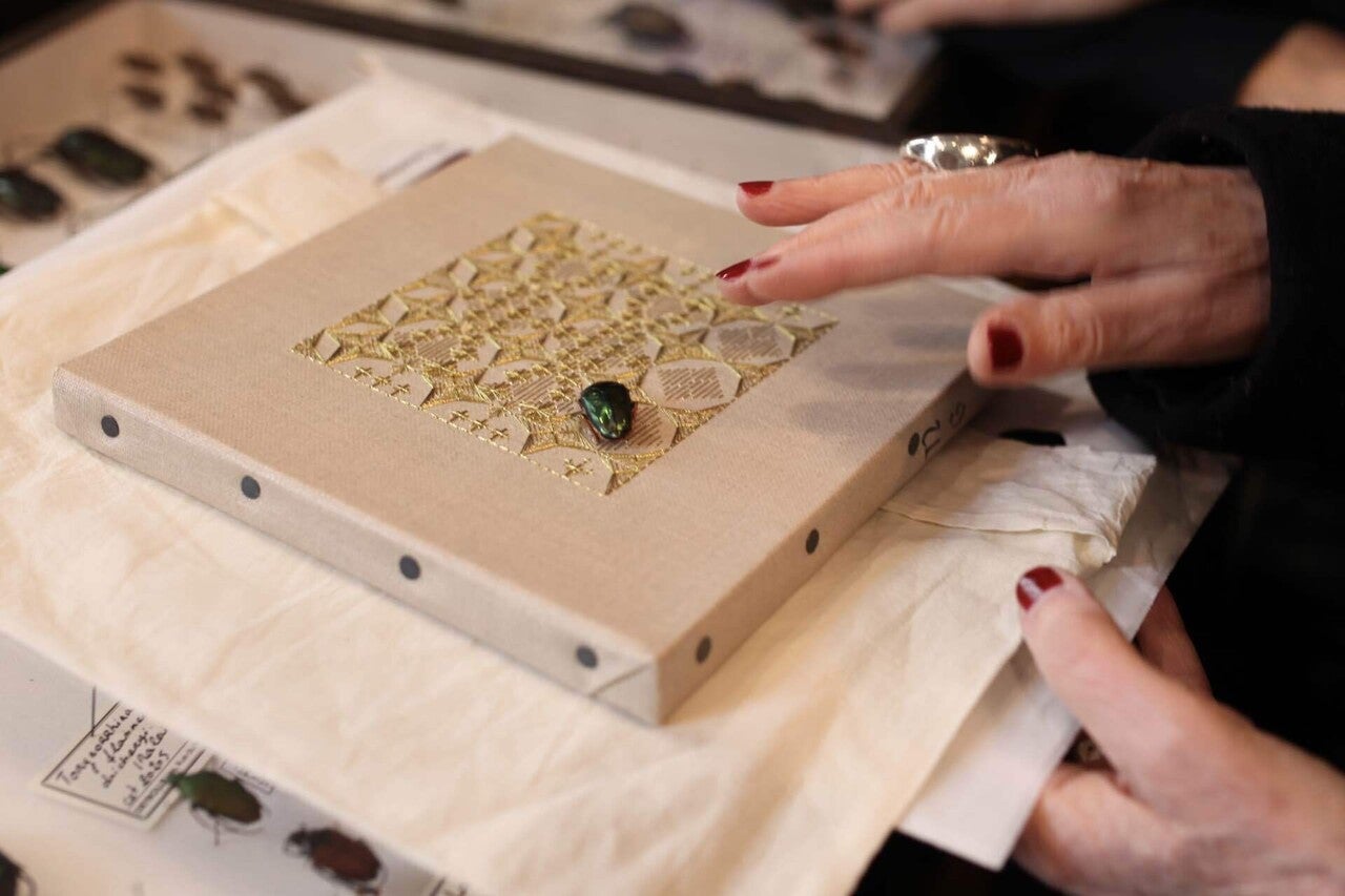 この日は、素敵なマダムが来店し、自身が施した刺繍に合う玉虫を探していた。