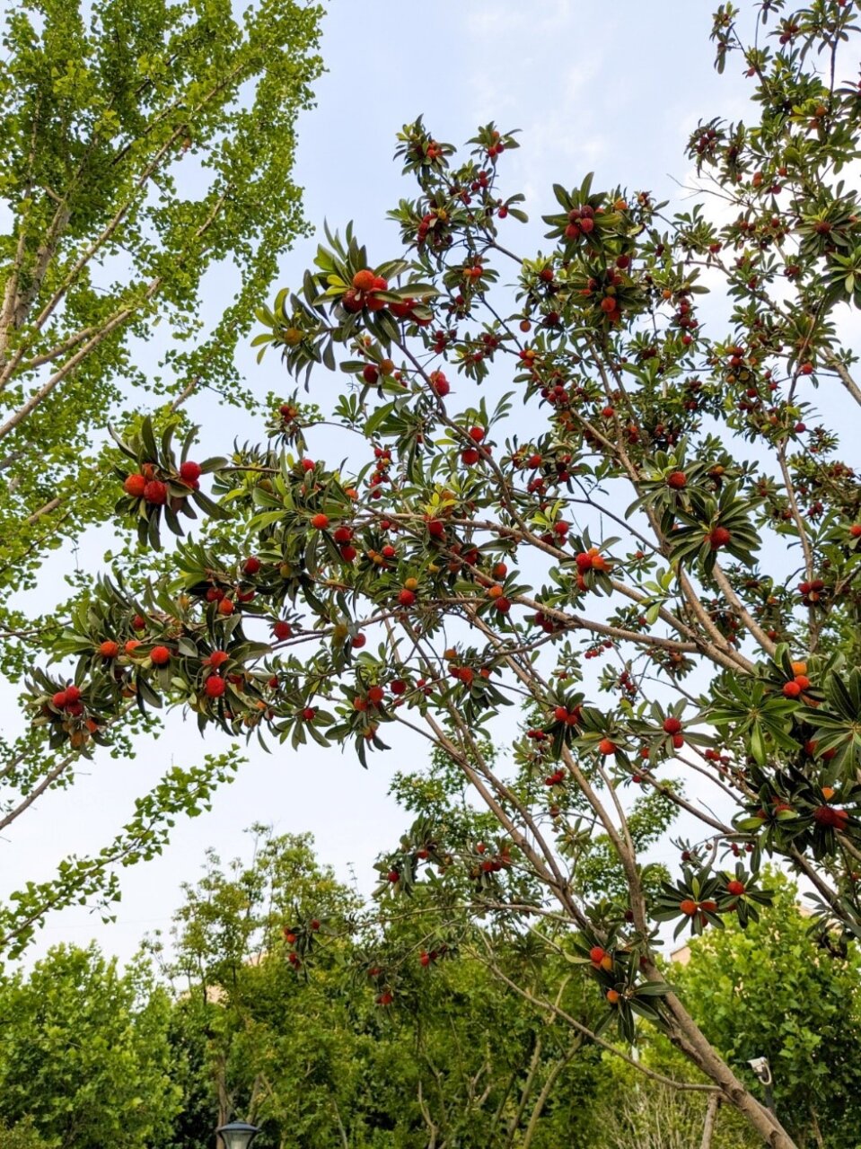 楊梅(ヤンメイ)というヤマモモの一種で、初夏にかけて小さな赤い実をむすぶ。