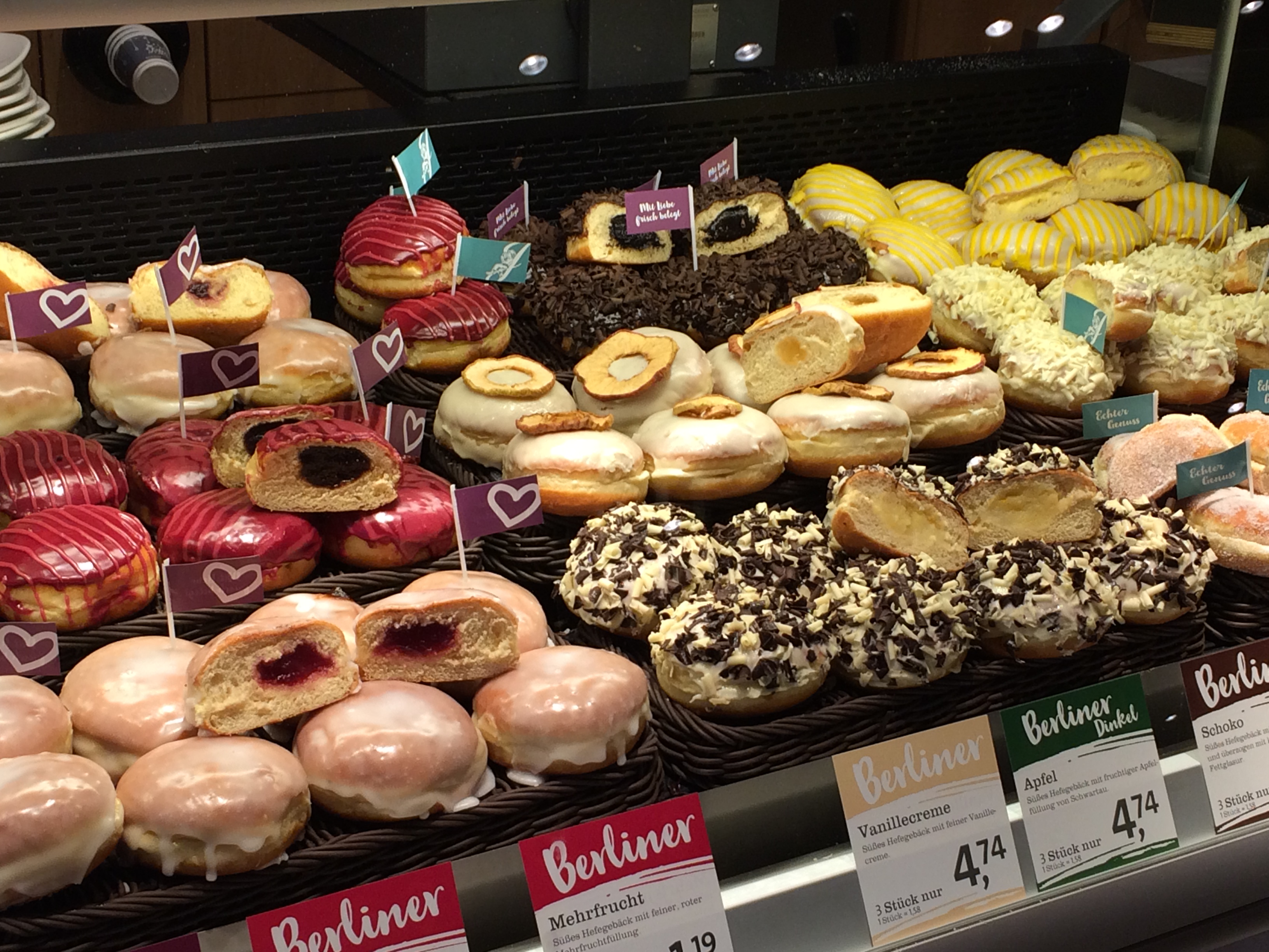 実は日本の某ドーナツ店にもカスタード入りのベルリナーが売られている。それに比べドイツのベルリナーの甘さは半端なく、ジャムの量も多くて一つ食べるのが精一杯。最近ではベルリナーも進化してチョコやアルコール入りのカスタードなど様々な種類が買えるようになった。